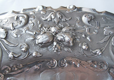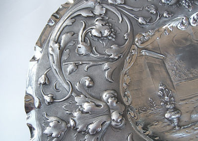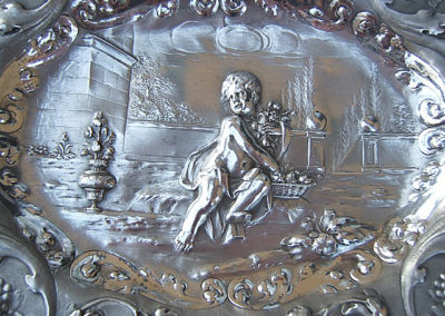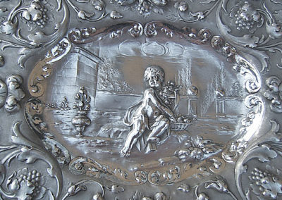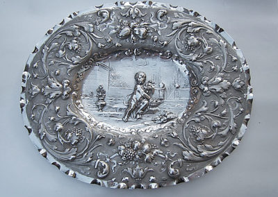 Ovale Platte mit wellenförmigen Rand. Im vertieftem Schalenboden reliefartig getriebener Dekor: Sitzender Putto mit Blumenkorb vor Ruinenlandschaft. Die breite Fahne ist mit barocken Ranken und Früchtedekoren verziert. Der Hintergrund ist punziert.