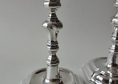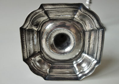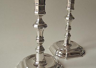Wohlproportionierte, schwer gearbeitete barocke Kerzenleuchter. Quadratische Fußplatte mit wellenförmig geschwungenen Kanten, leicht gemuldet ansteigend. Balusterfömrige Schaft mit kräftiger Voluten, daran kantig gegliederte Einstecktülle.