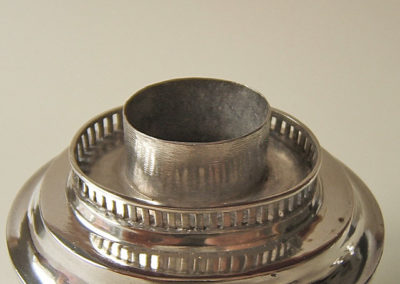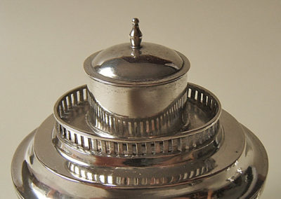 Silber getrieben, gegossen und ziseliert. Der ovale Korpus ist mit ziselierten Schmuckbändern verziert. Zur Schulter stufenförmig gearbeitet. Ein Gitterrand bildet den Abschluß. Darauf der Stülpdeckel mit zierlichem Knauf.