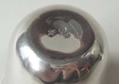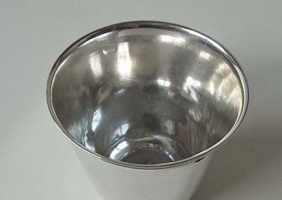 Silber getrieben. Schmuckloser, schlichte Formgebung. Der glockenförmige Becher hat einen profilierten Lippenrand und steht auf einer leicht gemuldeten Standfläche.