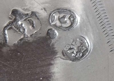 Gestempelt auf der Bodenunterseite mit der Stadtmarke, dem Meisterzeichen und der Feingehaltsmarke „13“.