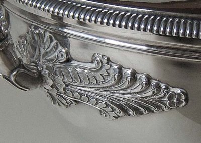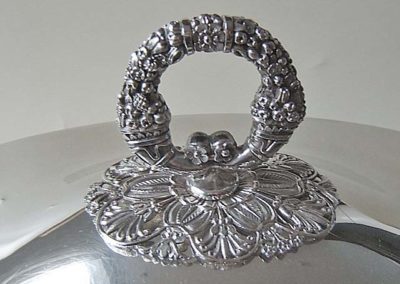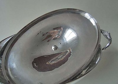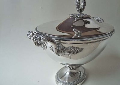 Die große Terrine steht auf einem ovalem Standfuß, der mit einem umlaufendem Palmettenfries verziert ist. Im Übergang zur eigentlichen Schale befindet sich ein godronierter Kranz. Tief gemuldeter ovaler Gefäßkörper mit seitlichen Handhaben, verziert mit reliefierten Blatt- und Blüten. Aufgesetzter Deckel. Der Griff ist entsprechend zu den Handhaben gearbeitet.