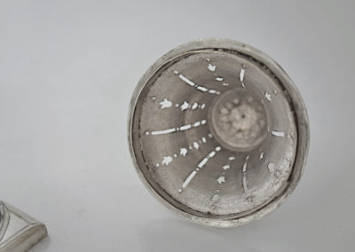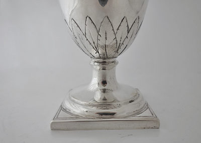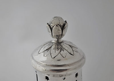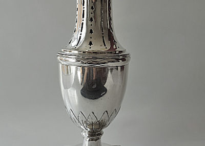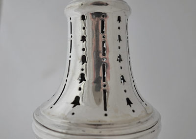 Der große Streuer steht auf einer quadratischen Fußplatte, die sich trompetenförmig erhebt. Daran der eifömige Gefäßkörper, der im unteren Wandungsdrittel mit ziseliertem Blattwerk verziert ist. Der haubenförmige Deckel wird mittels Bajonettverschluss am Korpus verbunden. Eine Blüte dient als Knauf.