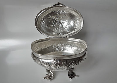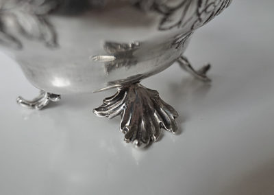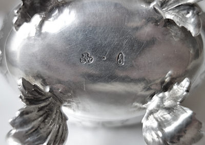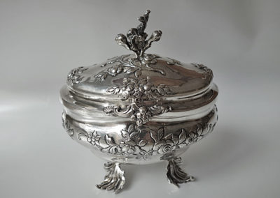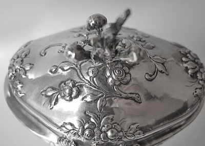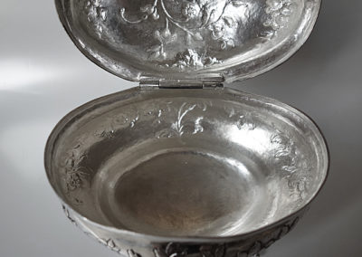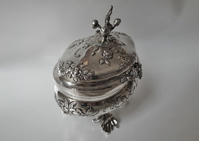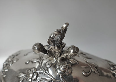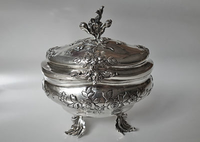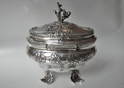 Die wohlproportionierte Zuckerdose steht auf vier ausgestellten Blattfüßen. Der Korpus ist oval, die Randzone geschwungen. Scharnierter Deckel, gegossene Blüten dienen als Knauf. Zierliche getriebene Blütendekore zieren die Oberfläche.
