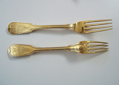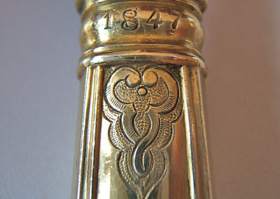 Neben dem Lötigkeitsstempel und dem Meisterzeichen sind alle Bestecke mit einem Datumsstempel „1847“ punziert. Die Stahlklingen der Messer tragen die Punzierung “G. Müller“