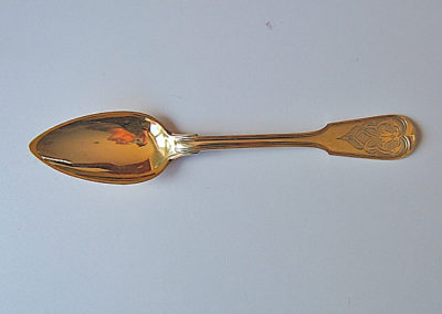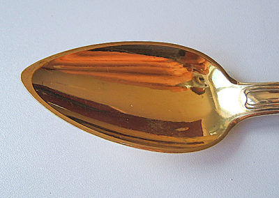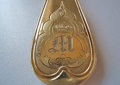 Stilistisch zweifelsfrei dem Barock zuzuordnen, denn feines Bandelwerk, wie es gegen 1720/30 als Schmuckelement Mode war, ziert die Griffe dieser Garnitur. Beim genaueren hinschauen fallen jedoch die spitzovalen Laffen an den Löffeln auf. Diese kamen erst gegen 1800 in Mode und lösten die ovalen Formen des 18. Jahrhunderts ab. Beim Betrachten der Markenpunzierung wird schnell klar, dass diese Stücke erst im 19. Jahrhundert entstanden sein können. Sämtliche Teile sind mit dem Lötigkeitsstempel „13“ für 13 lötiges Silber, entsprechend 812,5 Anteile Silber auf 1000 und dem Meisterzeichen Hermann gestempelt.