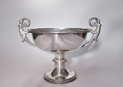 Tiefe, halbkugelige Schale auf einem hohen Standfuß. Feine Palmettbordüren zieren den Schalenrand und Fuß.