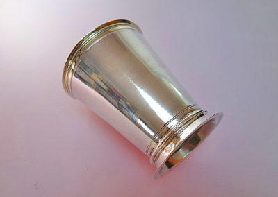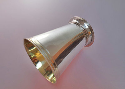 Der konische Becher mit seinem profilierten und vergoldetem Lippenrand steht auf einem gekehlten Standring.