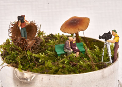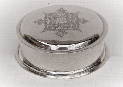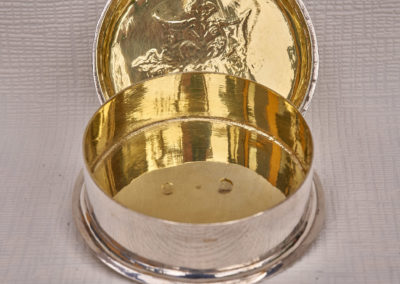 Die sehr gepflegte runde Dose steht auf einem breiten Standring. Der leicht gewölbte Stülpdeckel hat mittig einen sehr feinen gravierten und punzierten Bandelwerkdekor. Im Innern ist die Dose gänzlich Feuervergoldet.