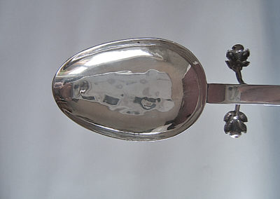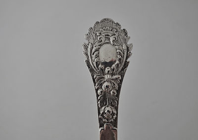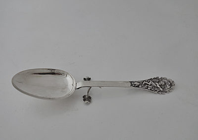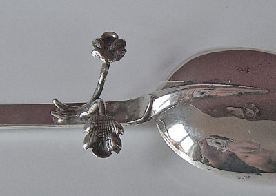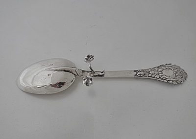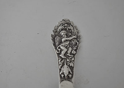 Silber geschmiedet und gegossen. Ovale Laffe und geschmiedetem Griff. Das gegossene Griffende ist Vorderseitig mit einem Putto zwischen Blüten und Rankendekoren verziert. Rückseitig Blütendekore mit einem bekröntem Wappenschild. Zwei zierliche Blattfüße dienen als Stand.