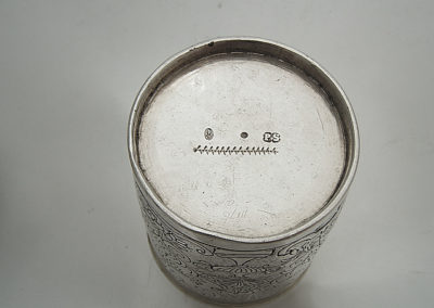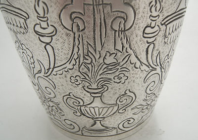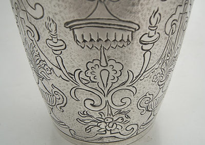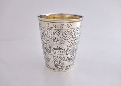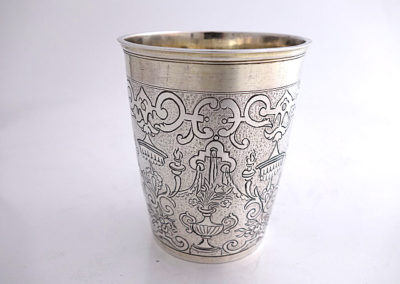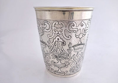Nahezu zylindrischer Becher mit profiliertem Lippenrand auf Standring. Auf der Wandung befindet sich ein aufwändig ziselierter Dekor mit Bandelwerk, Ziervasen, Baldachinen und Blütendekoren auf punziertem Grund.