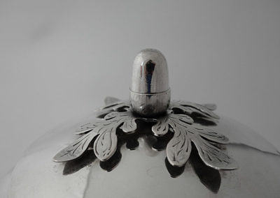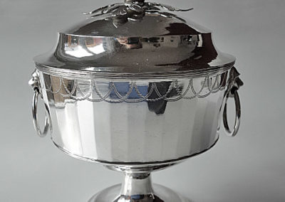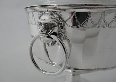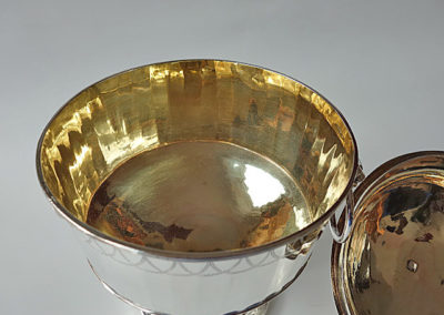 Schöne handwerklich gearbeitete Deckelschale aus teilvergoldetem Silber. Runder Standfuß, darauf der zylindrische Gefäßkörper, deren Wandung facettiert ist. Im oberen Bereich befinden sich in Stichelgravur ausgeführte Girlanden. Seitliche Handhaben aus gegossenen Löwenköpfen und deren Maulringe. Der Deckel ist aufgesetzt, als Knauf dient eine Eichel , die auf einem Eichenlaubkranz sitzt.