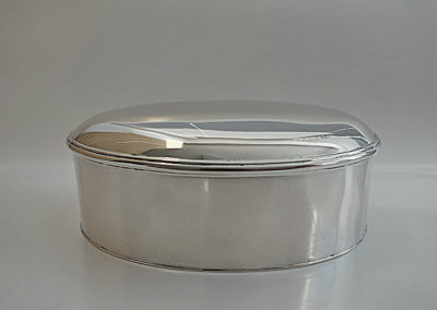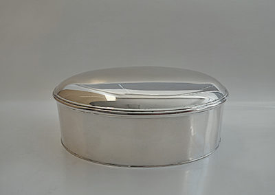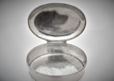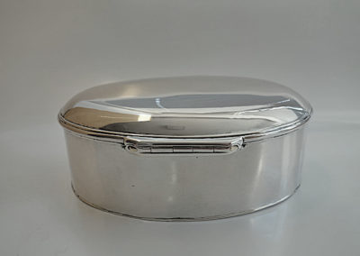Vornehme, ovale Dose mit scharniertem leicht nach oben gewölbten Deckel.