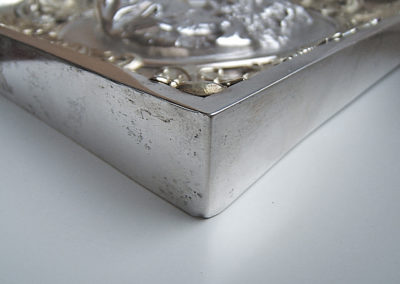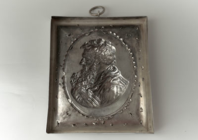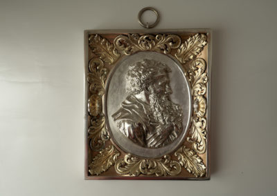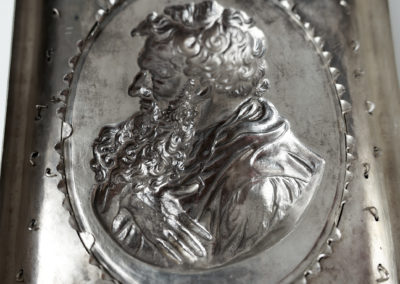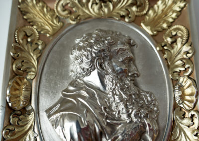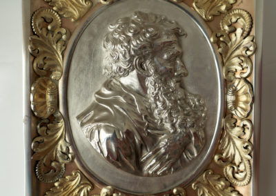 In einem prunkvollem Rechteckrahmen mit aufgelegten silber-vergoldeten Applikationen befindet sich die kräftig herausgetriebene und sehr fein ziselierte Plakette des Apostel Paulus. Diese Darstellung geht zurück auf den Entwurf eines Porträtmedaillons von Leonhard Posch (1750-1831)