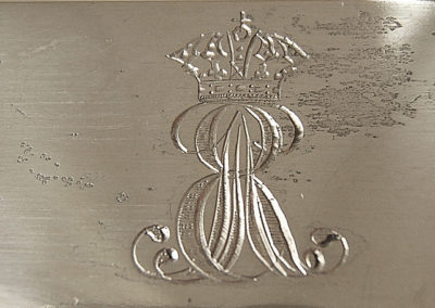 Auf der Rahmenaussenseite das gravierte Monogramm von Ernst August I von Hannover unter Königskrone. Am oberen Rand Ringöse zur Aufhängung.