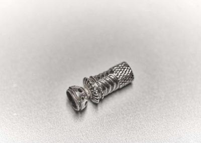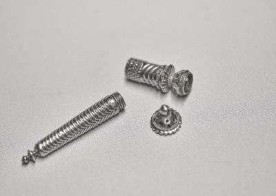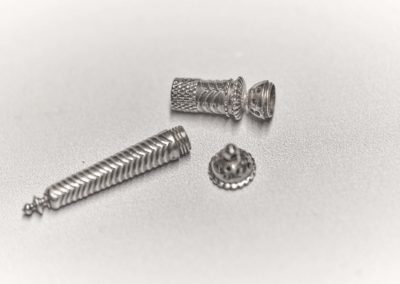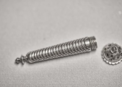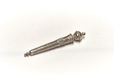 Silber gedrechselt. Einfach aufschraubbares Nadeletui mit Schuppendekor und Flechtwerkmuser. Als Abschluss Pomander mit Anhängeröse.