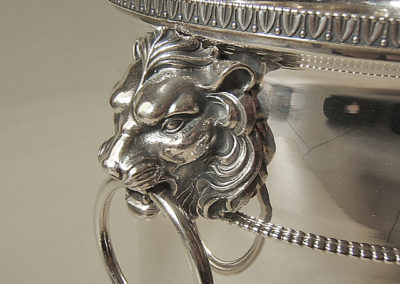 Zylindrischer Gefäßkörper auf gekehltem Fuß. Feine, umlaufende Zierbänder zieren das Gefäß. Seitlich befinden sich gegossene und ziselierte Löwenköpfe (verschraubt und abnehmbar). Im Maul bewegliche Ringe dienen als Griff.