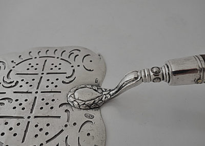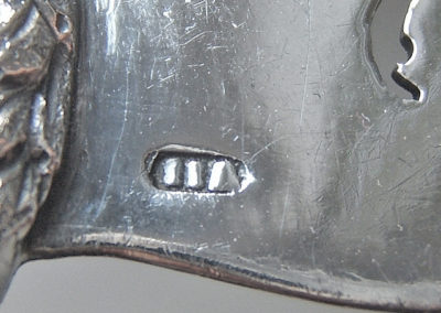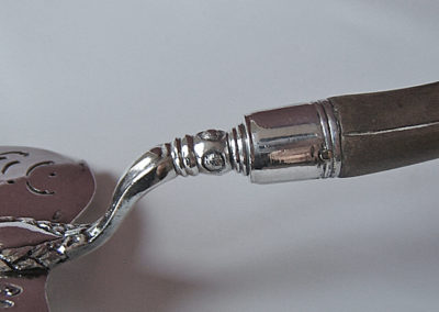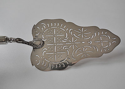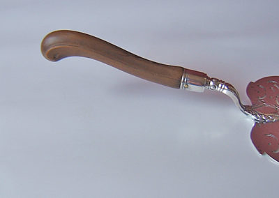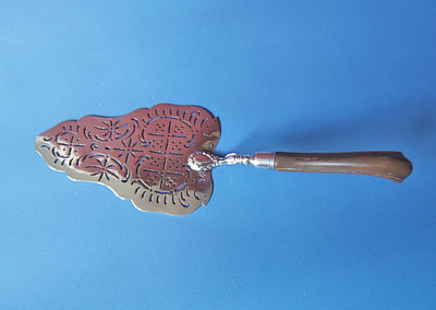 Blattförmige Laffe, die ornamental ausgesägt ist. Griffansatz mit Lorbeergirlanden. Originaler Holzgriff aus Birnbaum.