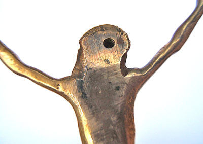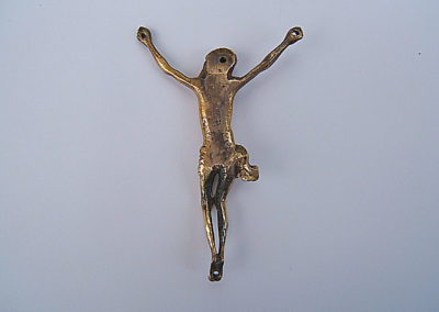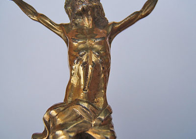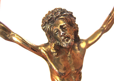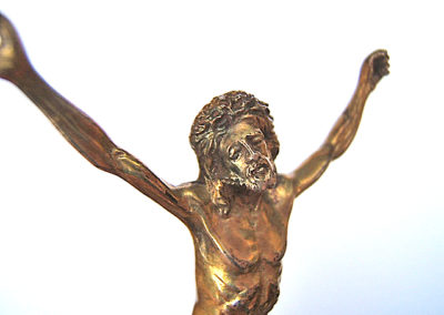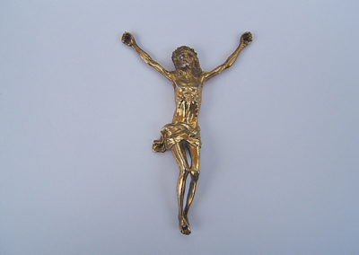 Fein ausgeführter Corpus Christi mit weit nach oben ausgestreckten Armen. Silber, vergoldet.