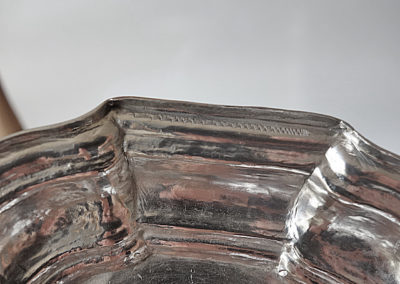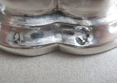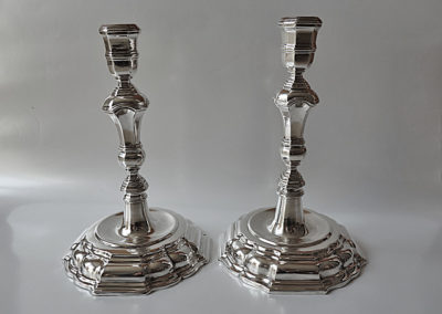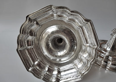 Das solide gearbeitete Paar Kerzenleuchter steht auf einem mehrpassig geschweiftem Fuß, der stufig getrieben ist. Der Schaft mit Einstecktülle ist gegossen und wird durch Baluster und kräftige Voluten gegliedert.