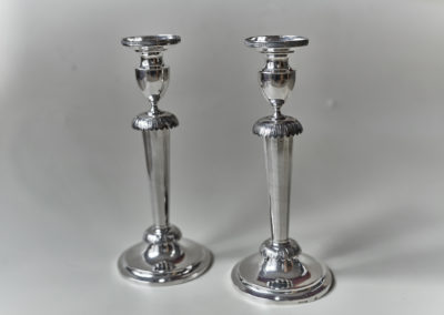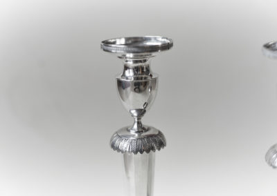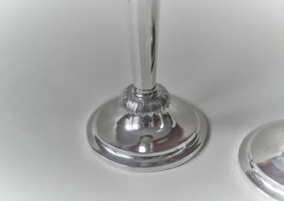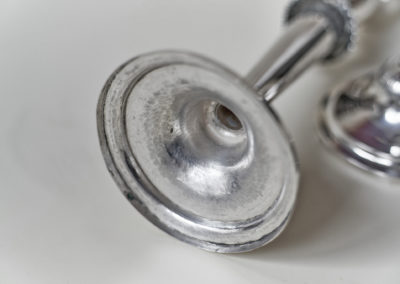 Auf einem getriebenem Rundfuß setzt sich der konische, kantig gegliederte Schaft fort, der in die vasenförmige Tülle mündet. Ein Kranz aus Blattfriesen schließt den Schaft nach oben und unten ab. Originale Einstecktüllen.