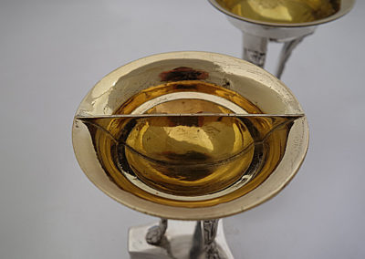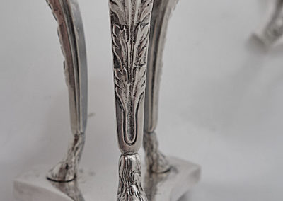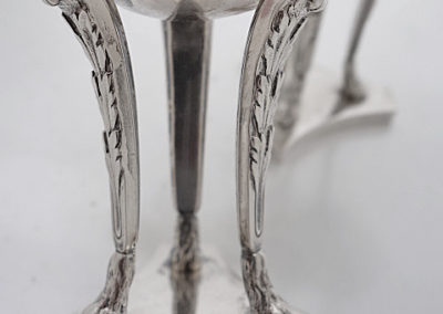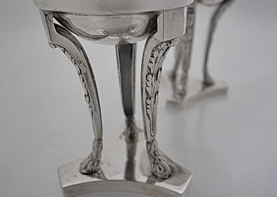 Auf einer dreieckigen Plinthe erheben sich jeweils drei gegossen Säulen, deren oberer Teil mit reliefiertem Blattwerk verziert sind und unten in Bocksbeinfüße münden. Die tiefen Schalen sind mittelgeteilt und mit einer Feuerveroldung versehen.