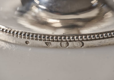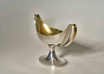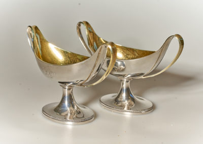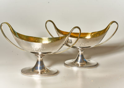 Bootsförmige Schalen mit elegant geschwungenen Griffen. Ovaler Fuß mit Perlstabbordüre. Sichtseitig Monogrammgravur „EG“