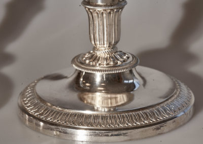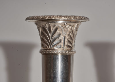 Paar vornehme und elegante Kerzenleuchter. Runder Standfuß mit Palmettfries. Leicht konischer Schaft, am Ansatz Stab- und Palmettbordüren. Am oberen Abschluss Palmett und Blütenfries auf punziertem Grund.