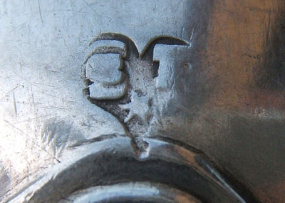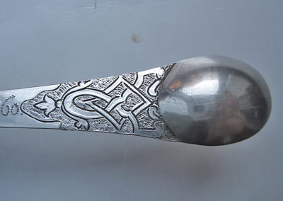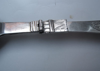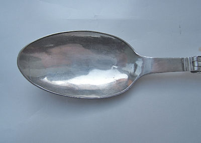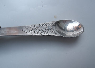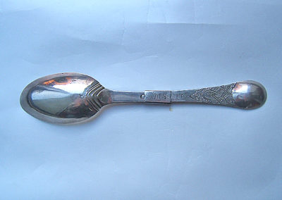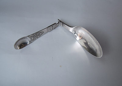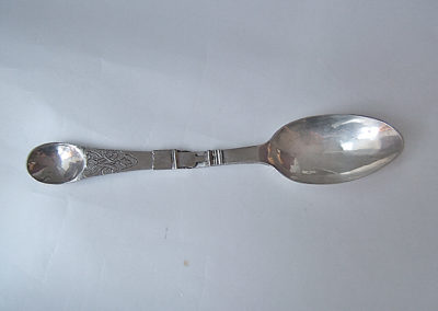 Reiseklapplöffel/Apothekerlöffel/Pharmazeutischer Löffel aus Silber. Feine Bandelwerksgravuren befinden sich auf dem Vorder- und Rückseitigem Griffende. Rückseitige Monogrammgravur „G M S“ 1760. Aufgrund des Dekores könnte der Löffel bereits in den 1730 er Jahren entstanden sein.
