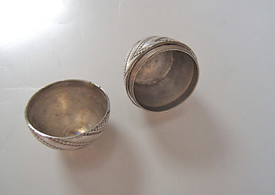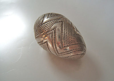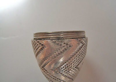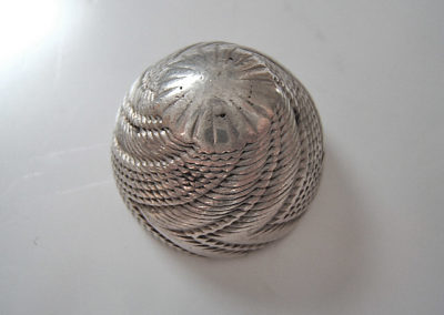 Riechdose/Pomander aus Silber, gedrechselt, mit Flechtwerkmuster verziert.