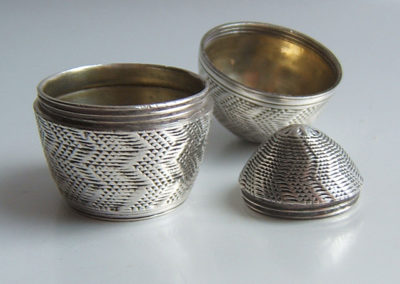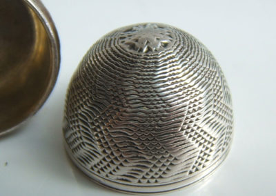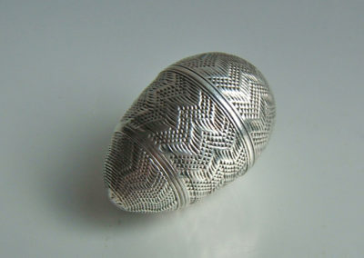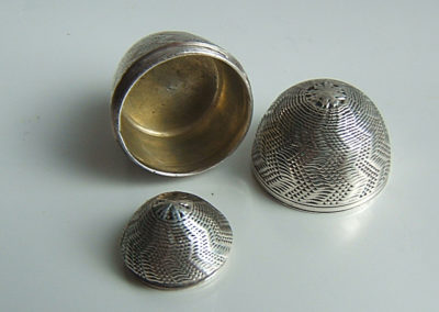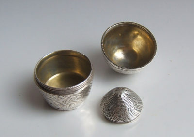 Riechdose/Pomander aus Silber, gedrechselt, mit Flechtwerkmuster verziert.