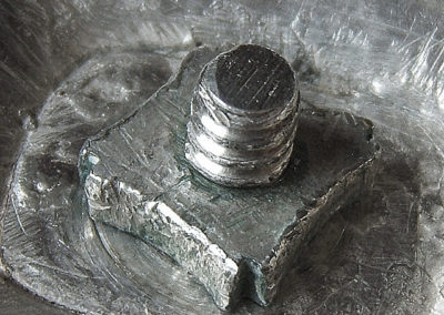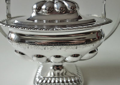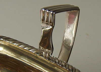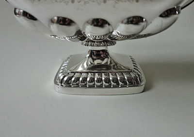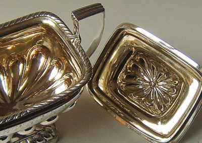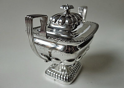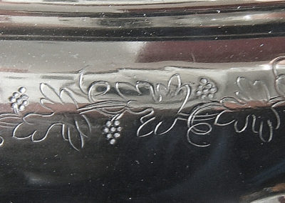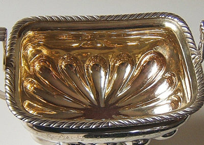 Rechteckiger, bootsförmiger Korpus, in der unteren Wandungshälfte mit herausgetriebenen Zungenornamten versehen ist. Darüber befindet sich ein zierlicher gravierter Weinlaubfries. Der Korpus ist mit dem Fuß verschraubt.