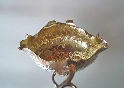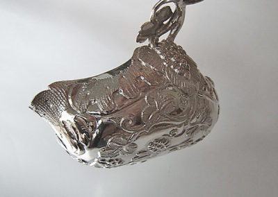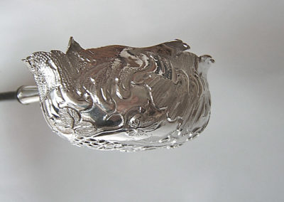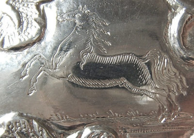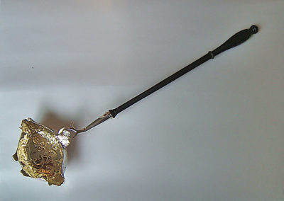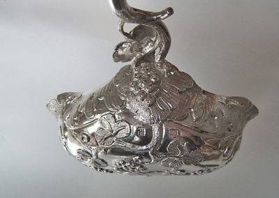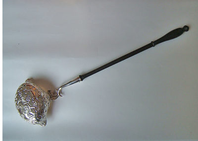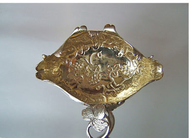 Schwer gearbeitete Bowlenkelle, im inneren mit einer schönen originalen Feuervergoldung versehen. Die Wandung ist mit einem außergewöhnlich üppig getriebenen und ziseliertem Weinlaubdekor verziert. Darin ein fein graviertes Wappen, ein springendes Pferd.