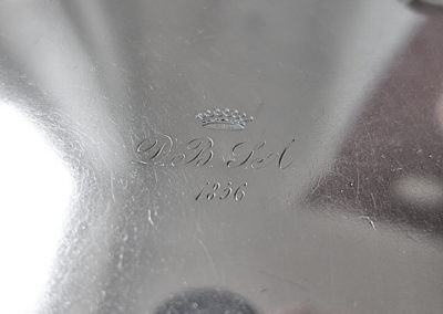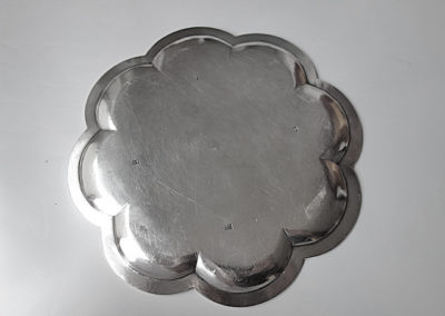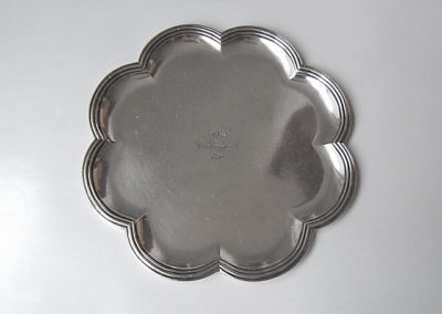 Schwer gearbeitetes Tablett. Mehrpassig, bogenförmig geschweiftem Rand. In der Mitte leicht vertieft. Darin Monogrammgravur „D.B.S.A. 1856 unter einer Freiherrenkrone.