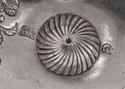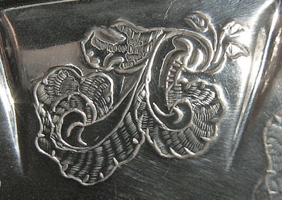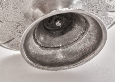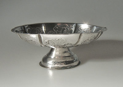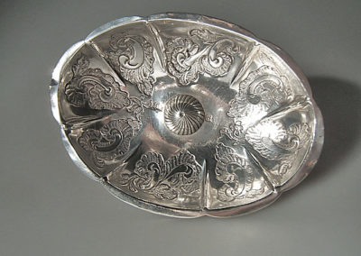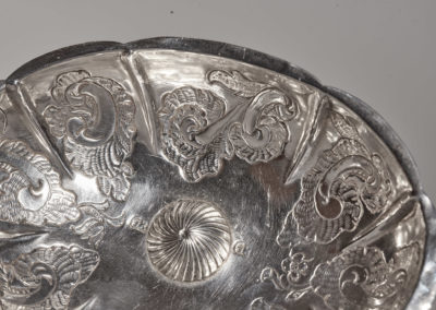 Auf ovalem nach oben getriebenen Standfuß befindet sich die mehrpassig geschweifte Schale, die durch gerade Züge gegliedert ist. Die Zwischenfelder sind mit fein getriebenen und ziselierten Rocaillendekoren gefüllt. Fuß und Schale sind miteinander verschraubt.