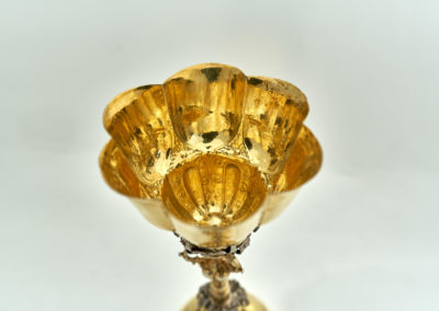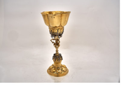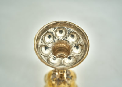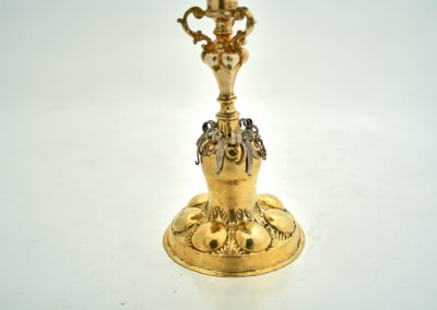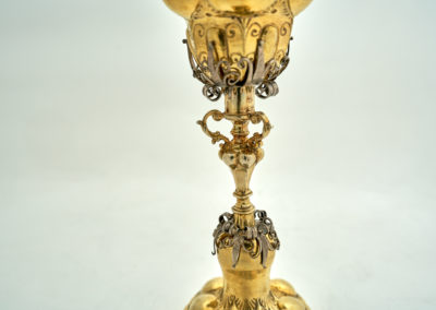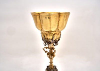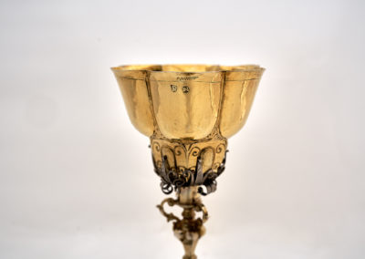 Der zierliche Pokal zeichnet sich durch seine vorzügliche Erhaltung aus. Er ist gänzlich feuervergoldet. Das ausgesägte Schweifwerk silberfarben belassen.