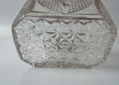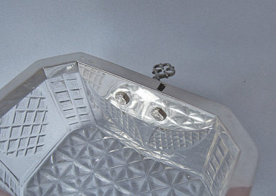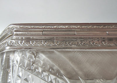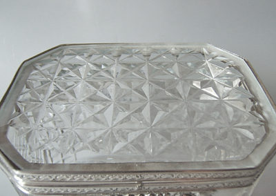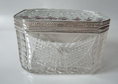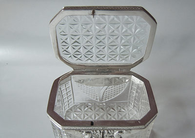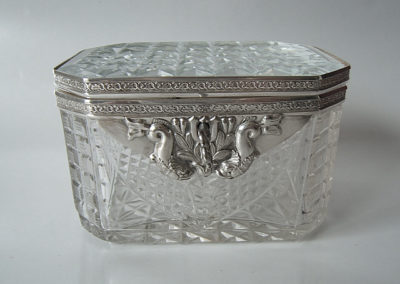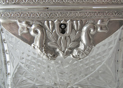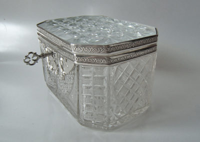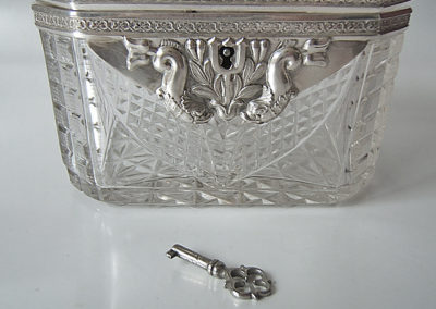 Die abschließbare Zuckerdose besticht durch seine allseitigen Kerbschliff und Kreuzschliffdekore. Sie hat eine rechteckige Grundform, die Kanten sind eingezogen. Ein schöner Kontrast bildet die zierliche Silbermontierung aus feinen Ornamentbändern, das Schlüsselschild zeigt zwei Delphine.